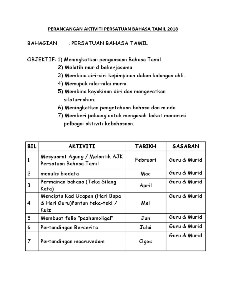 Perancangan Aktiviti Persatuan Bahasa Tamil 2018 Pdf